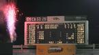 현대선수들이 5일 SK와의 시즌 최종전에서 승리를 한 직후 하이파이브를 나누는가운데 정규시즌 1위를자축하는 축포가 밤하늘을 수놓고 있다./수원=손용호 기자