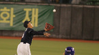 14일 플레이오프 2차전 8회말 1사 1루서 진갑용의 빗맞은 안타성 타구를 두산 2루수 안경현이 끝까지 ?아가 잡아내고 있다.