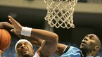 15일 잠실체육관에서 벌어진 프로농구 시범경기서 올 시즌 새로 들어온 외국인 선수들인 수원 삼성의 센터 바카리 헨드릭스(왼쪽. 198cm)와 원주TG삼보의 센터 자밀 왓킨스(194cm)가 치열한 다툼을 벌이고 있다.