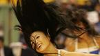 배꼽에 문신을 한 서울 삼성의 치어리더가 15일 잠실체육관서 벌어진 원주 TG삼보와의 시범경기에서 황홀한 율동을 선보이고 있다. /손용호 기자