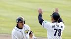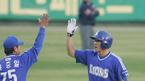 17일 플레이오프 4차전에서 4타수 4안타의 맹타를 휘두른 삼성 조동찬이 9회 1사 후 3루타를 친 뒤 유중일 코치와 하이파이브를 나누고 있다. /잠실=손용호 기자