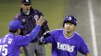 한국시리즈 1차전 8회 말 2사 2, 3루서 심정수의 안타 때 2루주자 이숭용이 홈을 파고 들어 승부를 굳히는 점수를 내고 있다. /수원=손용호 기자