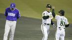 한국시리즈 1차전 5회말 적시타를 치거 1루로 나간 김동수가 김성갑 코치와 손을 마주치며 좋아하고 있다. 침울한 표정으로 땅을 내려다보고 있는 삼성 양준혁의 표정이 자못 대조적이다. /수원=손용호 기자