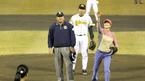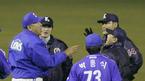 22일 한국시리즈 2차전 2회초 2사 2루서 삼성 김한수의 중견수 앞 타구를 심판진이 안타로 선언했다 현대측의 항의 후 아웃으로 번복하자 김응룡 삼성 감독이 항의하고 있다. /수원=손용호 기자