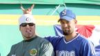 22일 한국시리즈 2차전에 앞서 연습 도중 만난 현대의 브룸바(왼쪽)와 삼성의 로페즈가 익살스러운 표정을 지어보이고 있다. /수원=손용호 기자