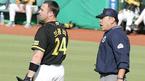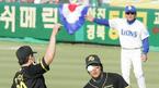 24일 한국시리즈 3차전 2회말 2사 2,3루서 현대 브룸바가 삼진을 당한 뒤 헬멧을 내던지며 불만을 나타내자 조종규 구심이 주의를 주고 있다. /대구=손용호 기자