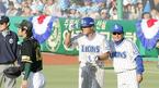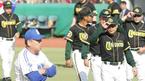 24일 한국시리즈 3차전 식전행사에서 김재박 감독 등 현대 코칭스태프가 모자를 벗으며 인사하고 있지만 김응룡 삼성 감독은 눈길을 주지 않고 있다. /대구=손용호기자