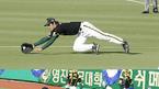 24일 한국시리즈 3차전 3회말 2사 2루서 강동우의 우전 안타성 타구를 현대 1루수 이숭용이 슬라이딩 캐치, 베이스 커버를 들어온 투수 김수경에게 정확히 송구, 아웃시키고 있다. /대구=손용호 기자