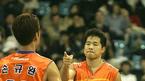 부산 KTF 현주엽(오른쪽)이 5일 열린 서울 SK와의 후반전에서 3점슛을 터뜨리고 백코트하고 있는 손규완을 손가락으로 가리키며 축하의 뜻을 전달하고 있다. 잠실학생체=손용호기자