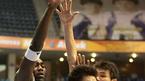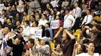 10일 잠실 경기 4쿼터 막판 원주 TG삼보의 승리가 굳어지자 응원석의 분위기도 양분되었다. 오른쪽의 TG삼보 응원단은 환호하고 있지만 왼쪽의 삼성 응원단은 침울한 표정을 감추지 못하고 있다./잠실체=손용호 기자