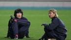 몰디브와의 월드컵 예선을 앞두고 해외파들이 모두 참여한 야간 적응 훈련이 15일 상암 구장에서 벌어졌다. 네덜란드에서 활약 중인 이영표가 역시 네덜란드 출신인 본프레레 감독과 간간이 몸짓도 섞어가며 대화를 하고 있다.