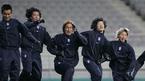 월드컵 대표팀의 핵심 멤버들인 이동국 안정환 유상철 박지성 이천수(왼쪽으로부터)가 손을 맞잡고 상암 구장에서 훈련하며 17일 몰디브전 필승의 결의를 다지고 있다./손용호 기자(폭탄뉴스.com)