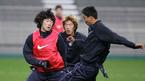그동안 잔 부상으로 결장이 잦았던 박지성(왼쪽)이 15일 상암 구장 훈련서 스타팅 멤버조에 편성돼 김상식(오른쪽)과 볼을 다투고 있다. 가운데 뒤는 김정우./손용호 기자(폭탄뉴스.com)