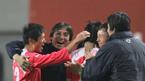17일 월드컵 아시아 2차 예선 몰디브전 후반 김두현이 깨끗한 중거리포로 지루한 0의 공방을 깨뜨린 뒤 벤치로 달려가 이춘석(왼쪽에서 두번째) 허정무 코치 등 코칭스태프와 껴안고 기쁨을 나누고 있다./손용호 기자(폭탄뉴스.c