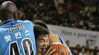 부산 KTF의 현주엽이 원주 TG삼보 왓킨스와 양경민의 더블팀 사이로 간신히 몸을 빼며 패스할 곳을 찾고 있다./부산=손용호 기자(폭탄뉴스.com)