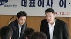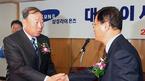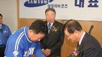 현대에서 FA로 나와 삼성에 입단한 심정수(오른쪽)와 박진만이 김응룡 신임사장의 취임식에 참석, 인사하고 있다./경산=손용호 기자(폭탄뉴스.com)