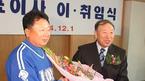 선동렬 감독이 1일 신임 사장으로 취임한 김응룡 전 감독에게 꽃다발을 건네고 있다./경산=손용호 기자(폭탄뉴스.com)