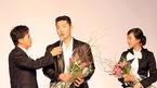 제 21회 코리아 베스트 드레서 상 스포츠 부문 수상자인 삼성 라이온즈 심정수가 수상 소감을 말하는 동안 인라인 스케이트 스타인 궉채이가 바라보고 있다. /하이야트 호텔=손용호 기자(폭탄뉴스.com)