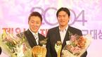 7일 2004 제일화재 프로야구 대상을 수상한 배영수(왼쪽)가 특별상을 받은 LA 다저스의 최희섭이 함께 포즈를 취하고 있다/프라자호텔=손용호 기자(폭탄뉴스.com)
