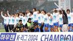 12일 2004 삼성 하우젠 K리그 챔피언 결정전 2차전서 승부차기 끝에 우승한 수원 삼성 선수단이 시상대에 올라 어깨동무를 하며 좋아하고 있다./수원=손용호 기자(폭탄뉴스.com)