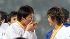 12일 프로축구 정규리그 챔피언에 오른 수원 삼성의 공격수 김동현(왼쪽)이 금메달을 깨물어 보고 있다./수원=손용호 기자(폭탄뉴스.com)
