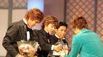 29일 서울 그랜드 힐튼 호텔에서 열린 2004 삼성 하우젠 K리그 시상식에서 미드필더 부문 수상자들이 가수 코요테로부터 상을 받고 있다. 왼쪽으로부터 김동진 김두현 김대의./손용호 기자(폭탄뉴스.com) [Copyright ⓒ OSEN(www.osen.co.kr)