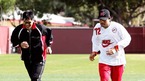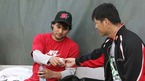 지난 18일(이하 한국시간)부터 로스앤젤레스에서 합동 훈련하고 있는 박찬호(왼쪽)와 구대성이 19일 USC 구장에서 휴식 시간에 그립에 대해 이야기를 나누고 있다./LA=린다 박 통신원 linda@poctannews.com