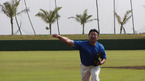선동렬 삼성 감독이 괌 전지훈련지에서 그물망도 치운 채 배팅볼을 던지고 있다. 공을 끝까지 노려보며 던지고 있는 폼이 현역 시절 강속구를 뿌릴 때와 똑같다. /삼성 라이온즈 제공