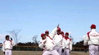 일본 나카사키에서 열리고 있는 스프링캠프에 참가 중인 한화의 투수 정민철이 13일 훈련 도중 SBS TV의 에서 '더듬이춤'으로 인기를 끌고 있는 개그맨 리마리오의 춤을 흉내내자 동료들이 폭소를 터뜨리고 있다. /한화 이글스 제