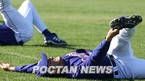 텍사스 레인저스의 애리조나주 서프라이즈 스프링캠프에서 2일(한국시간) 박찬호가 수비 훈련을 할 때 공을 담는 통에 앉아 자신의 차례를 기다리며 스트레칭을 하고 있다./서프라이즈(미국 애리조나주)=손용호 기자 spjj@poctann