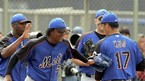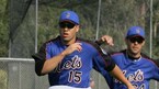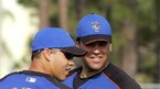 27일 두산 베어스와 한화 이글스의 잠실 경기에서 두산의 신인 선발 투수 김명제가 6이닝을 2피안타 무실점으로 호투한 뒤 공수가 교대되자 포수 홍성흔이 미트와 글러브를 맞부딪치며 격려하고 있다.잠실=주지영 기자 jj0jj0@poc