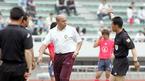 21일 부산 구덕운동장에서 벌어진 파크랜드컵 2005 부산 국제청소년대회 한국-모로코의 개막전 전반 30분께 유병섭 주심이 백승민의 얼굴을 가격한 타리크 벤다무에게 경고를 주자 자말 파티 모로코 감독이 대기심의 만류에도