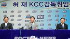 허재 전주 KCC 신임 감독이 18일 오후 서울 서초동 본사 전시관에서 취임식 및 기자회견을 가졌다. 왼쪽부터 정몽익 KCC 구단주, 허재 감독, 안문기 단장./주지영 기자 jj0jj0@poctannews.com (Copyright ⓒ 폭탄뉴스 www.poctannews.com 무단전재