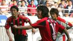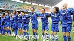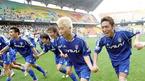 수원 삼성이 8일 수원 월드컵경기장에서 벌어진 2005 삼성 하우젠컵 대회 최종일 성남 일화전에서 1-0으로 승리, 지난해 정규리그부터 4개 대회서 연속으로 우승했다. 결승골을 넣은 고참 김대의(오른쪽)가 후배들과 손을 맞잡고