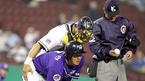 19일 두산 베어스와 SK 와이번스의 잠실경기 SK의 5회초 1사 1,2루서 2루 주자 조원우의 3루 도루 때 두산 포수 홍성흔의 3루 송구를 타자 이호준이 방해한 것 아니냐며 김경문 감독이 타석에 들어서서 나광남 구심에게 항의하고 있