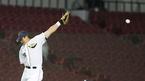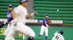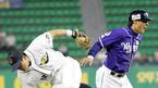 19일 두산 베어스와 SK 와이번스의 잠실경기 SK의 5회초 1사 1,2루서 3루 도루를 시도한 2루 주자 조원으로 잡기 위해 던진 두산 포수 홍성흔의 송구가 김동주가 점프해도 잡을 수 없을 정도로 높아 좌익수 쪽으로 빠지고 있다./잠
