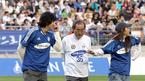 20일 수원 월드컵경기장에서 벌어진 잉글랜드 프리미어리그 2004~2005시즌 챔피언 첼시와 수원 삼성의 친선경기에 앞서 시축을 마친 인기 가수 이효리(오른쪽)와 탤런트 권상우(왼쪽)가 윤종용 삼성전자 대표이사 부회장과 함께