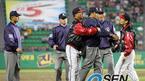 24일 LG 트윈스와 롯데 자이언츠의 잠실 경기 5회초 2사 3루서 롯데 정수근의 3루 선상 타구가 안타로 판정된 뒤 항의하러 나온 이순철 LG 감독과 박기태 구심(가운데)이 말다툼을 벌이자 황병일 LG 코치가 박 구심을 말리고 있다.