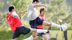 2006 독일월드컵 아시아 최종예선 우즈베키스탄, 쿠웨이트전에 대비해 24일 태극전사들이 파주 NFC에 소집돼 첫 훈련을 실시했다. 미니게임에서 정경호(가운데)가 골키퍼 김용대(오른쪽)를 앞에 놓고 슈팅을 날리고 있다./파주=손