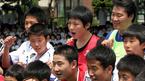 정몽준 대한축구협회장과 이천수가 학원 체육 활성화를 위한 행사의 일환으로 30일 오전 경기도 고양시 화정에 위치한 백양중을 방문, 학생들에게 인사하고 있다. 이천수는 학생들을 대상으로 한 간단한 강연에 이어 백양중 축
