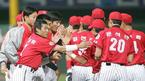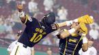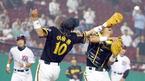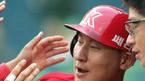 7일 SK 와이번스와 기아 타이거즈의 인천경기 기아의 4회초 선두 타자로 나온 심재학이 우월 솔로 홈런을 날리고 들어온 뒤 축하해 주는 동료의 손을 보며 심재학이 얼굴을 때리는 줄 알고 몸을 움찔하고 있다./인천=손용호 기자