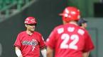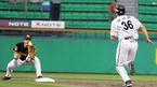 9일 문학구장에서 열린 SK 와이번스와 기아 타이거즈의 경기 기아의 2회초 마해영이 자신의 타구가 가운데 펜스 바로 앞에서 잡히자 아쉬운듯 1루 베이스를 발로 차는 시늉을 하고 있다./인천=손용호 기자spjj@osen.co.kr [Copyright ⓒ