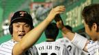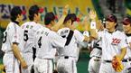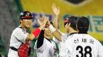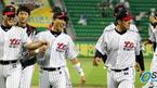9일 LG 트윈스와 현대 유니콘스의 잠실경기서 LG가 투수전 끝에 2-1로 이겼다. 3명의 투수와 배터리를 이뤄8안타를 허용하고도 1실점으로 막는 투수 리드로 승리에 기여한 LG 고참 포수 김정민이 후배들과 승리의 기쁨을 나누고 있