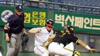 9일 LG 트윈스와 현대 유니콘스의 잠실경기서 1-1이던 8회말 2사 1,3루 박병호 타석 때 현대 투수 김수경이 1루주자 박용택에게 견제구를 던지는 사이 홈으로 달려들어 결승점을 올린 이성렬(오른쪽)이 손으로 세이프 사인을 내는