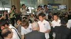 6회 연속 월드컵 본선 티켓을 따낸 국가대표 축구팀이 10일 아침 KE952편으로 개선했다. 이동국 등 국가대표 선수들이 사진기자들의 뜨거운 취재 열기 속에 축구협회 관계자들의 환영을 받고 있다./인천공항= 손용호 기자 jj0jj0@ose