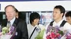 6회 연속 월드컵 본선 티켓을 따낸 국가대표 축구팀이 10일 아침 KE952편으로 개선했다. 박지성이 본프레레 감독과 주장 이운재 등이 서 있는 뒷줄에서 동료들과 얘기하며 좋아하고 있다./인천공항= 손용호 기자 jj0jj0@osen.co.kr [Copy