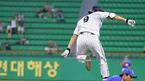 16일 삼성 라이온즈와 LG 트윈스의 잠실경기 2회말 2사 2루서 LG 이병규가 2루수 땅볼을 친 뒤 송구가 1루 뒤쪽 파울 지역으로 쏠리며 빠지자 다이빙 캐치를 시도한 삼성 1루수 김한수를 뛰어 넘으며 볼의 위치를 확인하고 있다. 이