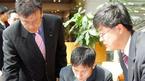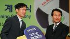 기아자동차가 축구 홍보대사로 유럽 무대에서 활약하는 국가대표 스타 이영표 설기현 박지성 차두리를 선정, 23일 오전 서울 양재동의 본사에서 자동차 증정식을 가졌다. 차두리가 자신의 사진에 기념 사인한는 옆에서 설기현(