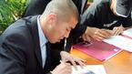 기아자동차가 축구 홍보대사로 유럽 무대에서 활약하는 국가대표 스타 이영표 설기현 박지성 차두리를 선정, 23일 오전 서울 양재동의 본사에서 자동차 증정식을 가졌다. 이영표가 계약서에 서명하고 있다. 본인들의 희망에 따