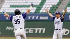 25일 인천 문학 구장에서 벌어진 SK 와이번스와 삼성 라이온즈의 경기 3회말 1사 만루서 삼성 선발 투수 임창용으로부터 우중월 만루 홈런을 빼앗은 뒤 두 팔을 치켜들며 쳐낸 SK의 이진영이 김동재 1루 주루코치와 함께 두 팔을